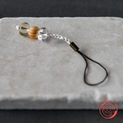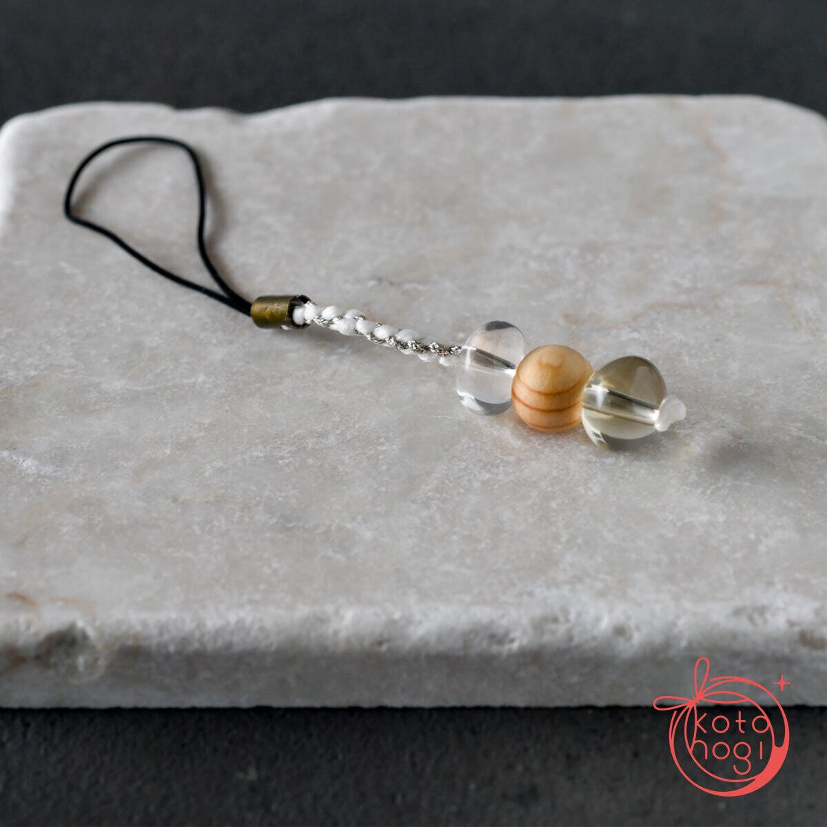 吉野槙、みかん玉水晶、みかん玉レモンクォーツで仕立てた、天然石のお守りストラップ「玉くし」です。