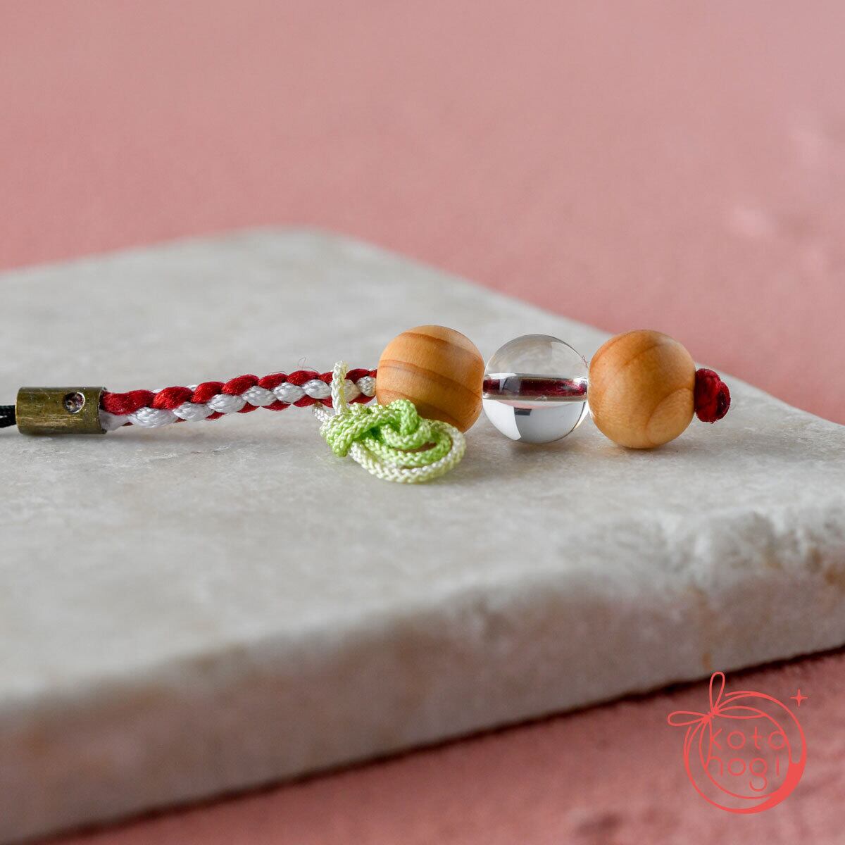 高野山壇上伽藍中門の檜「明星」と水晶で仕立てた、木珠と天然石のお守りストラップ「玉くし」です。