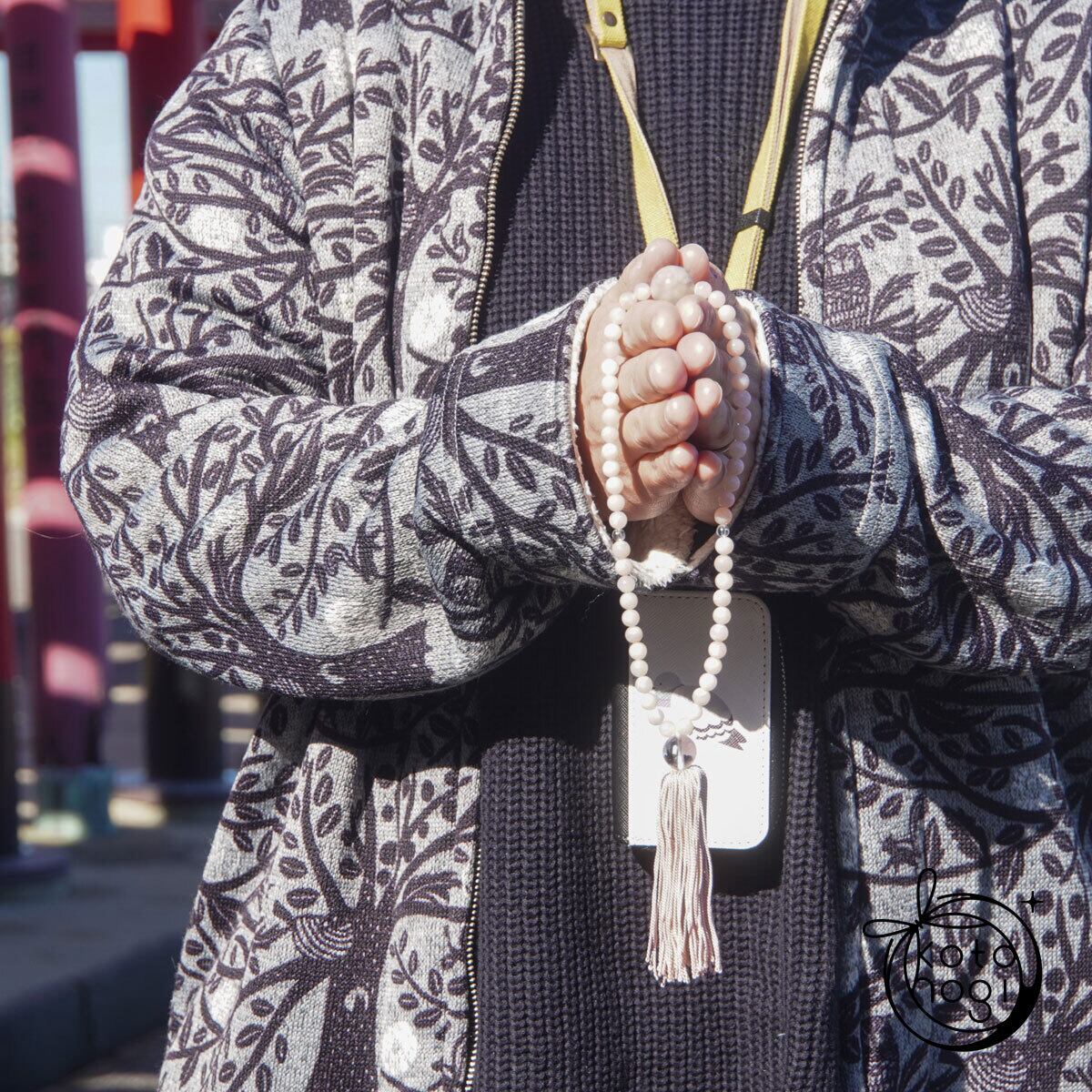 2wayお守り数珠「ふたえ」は略式念珠の作法は尊重しつつ、ファッショナブルに、個性を出すことができる念珠にしたい、という想いで製作しています。珠には天然石を使いながら、房にも個性的な特徴を持たせています。2重にして腕に巻き付けてお守りブレスレットとしても使用できる2wayのお守り数珠は、神社仏閣への参拝の際や、常時携帯するお仕事でも使いやすいと人気です。 2wayお守り数珠「ふたえ」はただ長いだけの数珠ではなく、2重にして装着した際にきちんとブレスレットになるように設計をしております。